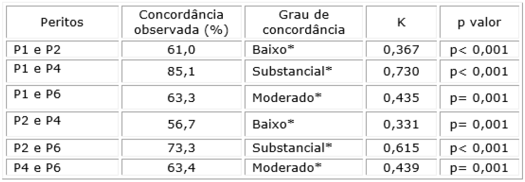 Para avaliar a concordância geral observada entre os Peritos no que diz respeito à avaliação penal das lesões dentais, foram realizados cruzamentos entre P1 e P2, P1 e P4, P1 e P6, P2 e P4, P2 e P6, P4 e P6. P3 e o P5 foram excluídos desta análise, em virtude da pouca quantidade de laudos por eles avaliados, de acordo com os critérios de inclusão e exclusão estabelecidos por este estudo. Para esta análise, foi considerada uma mesma quantidade de laudos por peritos perante um mesmo tipo de lesão. O grau de concordância foi mensurado pelo Índice Kappa e admitiu-se significância estatística para p< 0,05. Desta forma, a tabela 2 expressa os resultados obtidos por esta avaliação.