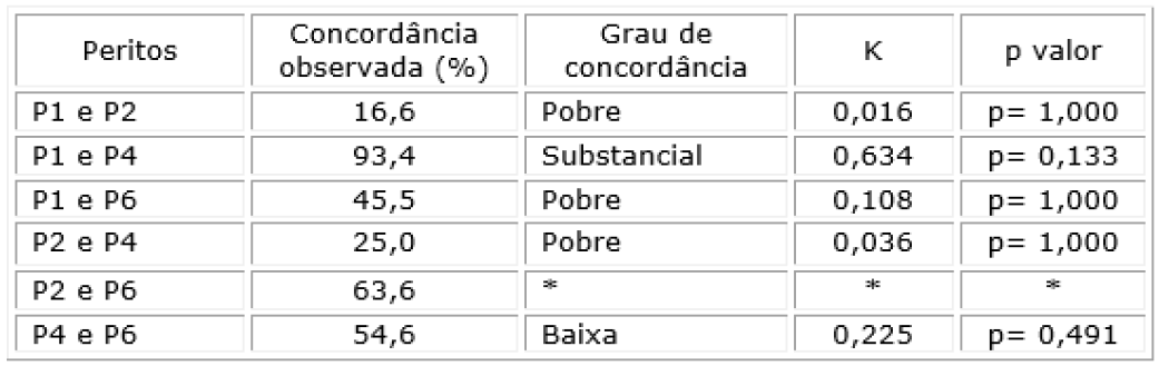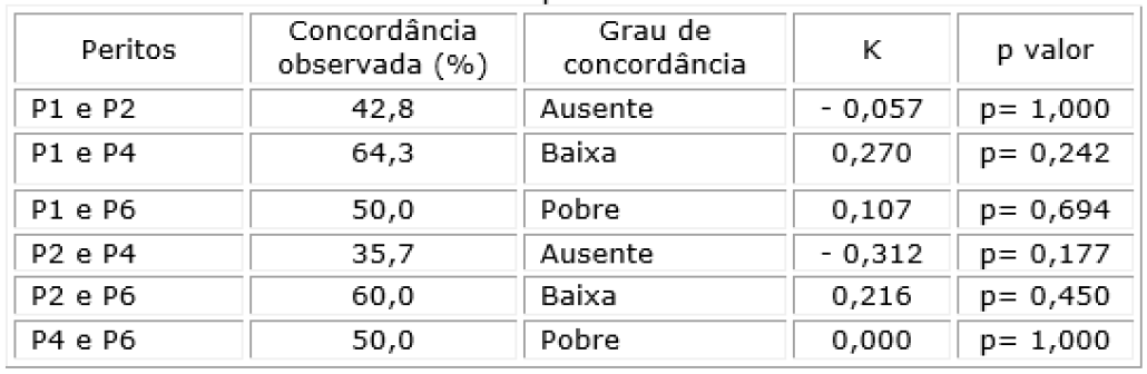O presente trabalho avaliou, também, a concordância observada entre os Peritos Odontolegistas..Desta forma, observou-se que entre P1 e P2 e entre P2 e P4, houve um grau de concordância baixo; entre P1 e P6 e entre P4 e P6, houve um grau de concordância moderado; entre P1 e P4 e entre P2 e P6, houve um grau de concordância substancial.