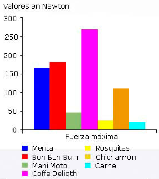 Las muestras se analizaron de manera separada. La fuerza máxima requerida para la maceración de cada uno de los grupos de alimentos puestos a prueba se observan en la figura, en la cual resulta el Coffe Deligth® con la mayor fuerza requerida (268,25 N), seguido del Bon Bon Bum® con un valor de 179,5 N y luego las mentas con 165,25 N; mientras que se presentan los valores más bajos para la carne bovina y las rosquillas, respectivamente.