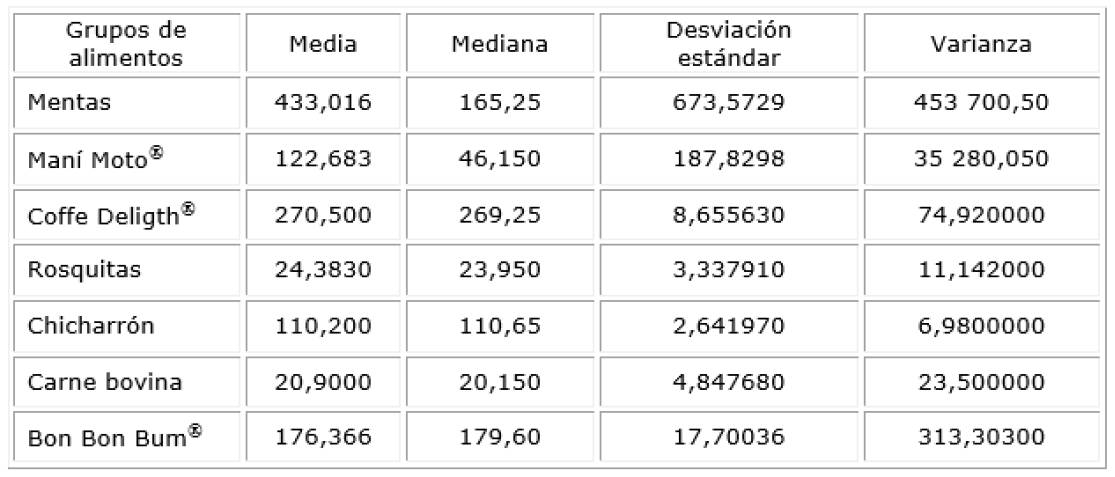 Posterior a la recolección de los datos, se elaboró tabla matriz en Microsoft Excel versión para Windows 7. Seguidamente se aplicó la prueba para el ajuste de los datos a una distribución normal Shapiro Wilk, la cual fue aplicada a cada una de las muestras. Los resultados obtenidos fueron: rosquillas (pasta redonda horneada) (sig. 0,901); carne bovina (sig. 0,908); chicharrón (tocino de cerdo frito) (sig. 0,264); y Bon Bon Bum® (chupete) (sig. 0,297). Todas estas no rechazaron la hipótesis de normalidad, mientras que sí la rechazaron las mentas (dulce duro de menta) (sig.0,000); Maní Moto® (maní recubierto de harina cocida) (0,000) y Coffe Deligth® (dulce duro de café) (sig.0,000). Igualmente no cumplieron los supuestos de normalidad las gráficas de probabilidad normal e igualdad de varianzas. En consecuencia se decidió utilizar las pruebas no paramétricas Kruskal-Wallis para muestras independientes y Mann-Whitney para dos muestras independientes por medio del programa estadístico SPSS v 22 IBM y un nivel de significancia p< 0,05.