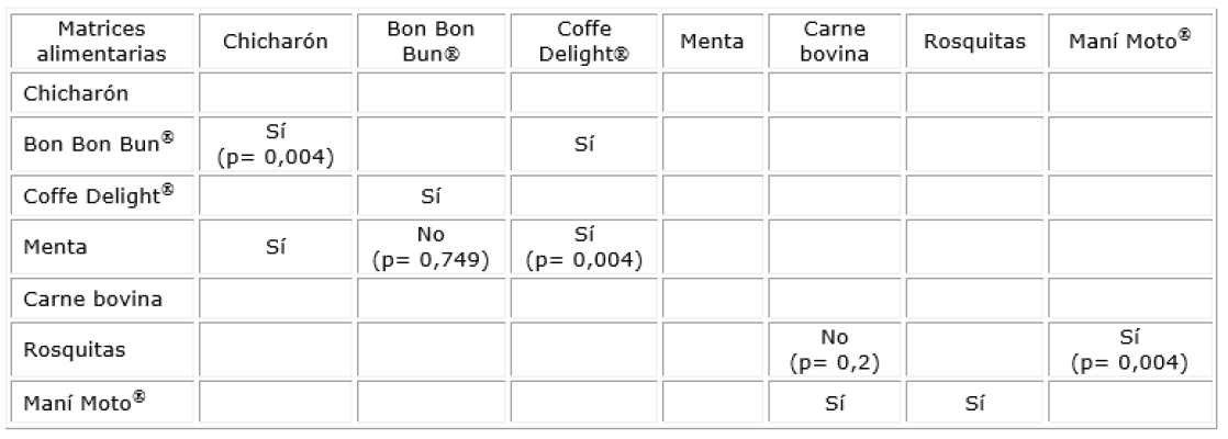 Los resultados de las comparaciones de muestras según el estadígrafo de de Mann Whitney se pueden observar en la tabla 2. Todas las muestras presentaron diferencias estadísticas significativas a excepción de las muestras de rosquita y carne bovina (p= 0,200) y de menta y Bon Bon Bum® (p= 0,749) (tabla 2).