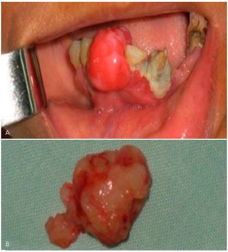 A la exploración estomatológica se evidencia la lesión tumoral, de base pediculada, de 3 cm de diámetro, indurada a la palpación y de color rojizo, que recubría órganos dentales canino e incisivo lateral derecho. Se observa que la paciente presenta una higiene bucal deficiente, acompañada de enfermedad periodontal severa y edentulismo parcial bimaxilar. En el procedimiento se realizó exéresis de la lesión desde su base, bajo anestesia local infiltrativa, y seguidamente se envió la muestra a estudio histológico, el cual confirmó el diagnóstico de granuloma telangiectásico (Fig. 1, A y B).