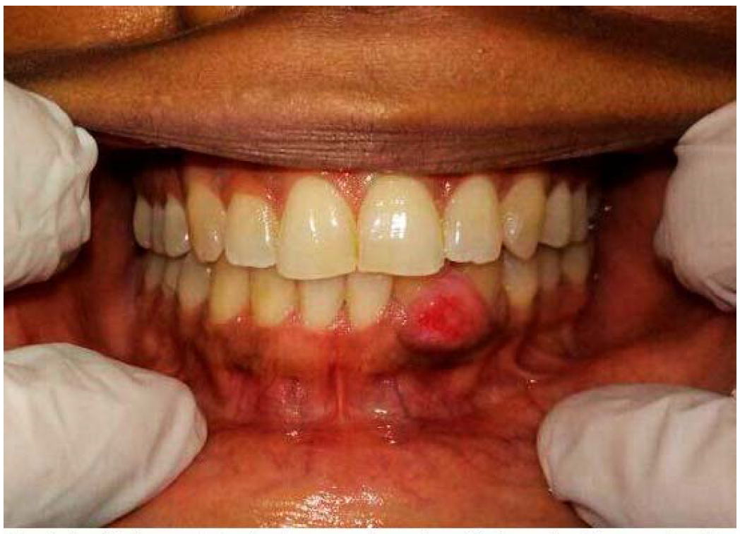 Paciente femenina de 28 años de edad, sin antecedentes médico-personales de interés ni alergias medicamentosas conocidas. Asiste a consulta por presentar una tumoración de 1 año de evolución, localizada en zona anteroinferior izquierda. No refería sintomatología, pero sí un ligero sangrado al momento de cepillarse.