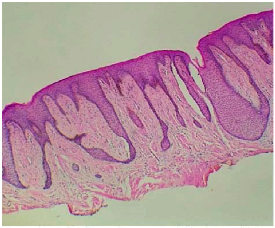 En todos los casos notificados en este estudio, las muestras tomadas mostraron en el examen histológico una proliferación de tejido fibroso, con áreas colagenizadas, tapizado por epitelio escamoso hiperplásico e infiltrado inflamatorio leve con tejido de granulación. No se observan mitosis, atipias ni necrosis (Fig. 3).