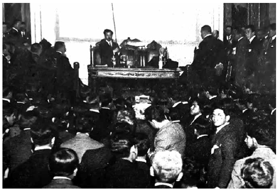 El 1º de mayo fue a visitar al Señor Ministro de Fomento y al Director de Salubridad Pública. También fue a presentar su respeto al Jefe de Estado, Augusto B. Leguia. En días pasados, acompañado de algunos médicos peruanos, visitó los hospitales 2 de mayo y Santa Ana 12. La Dirección de Salubridad Publica había invitado a los médicos y estudiantes de medicina a una conferencia del Dr. Noguchi a las 5 de la tarde del 2 de junio en el Paraninfo de la Facultad de Medicina 13. Al final de su conferencia en que sostuvo que su vacuna como medida preventiva y el suero como curativo de la fiebre amarilla funcionaban, remarcó que el saneamiento ambiental y la erradicación del mosquito Aedes aegypti eran las mejores medidas de prevención 14 (Figura 2).