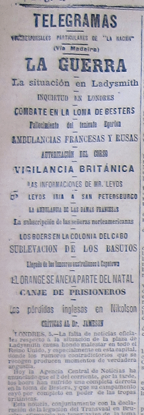 En muchos sentidos, naturalmente, estos telegramas seguían siendo noticias de Europa. Como muestran las imágenes, los cables que en La Nación informaban sobre la actualidad de la guerra sudafricana, estaban fechados en Londres. Algo similar podría decirse de las breves de Egipto o la India, o de las de Argelia y o el Sudán, que provenían de París. Londres-céntrica y París-céntrica, la trayectoria de las noticias tiende a confirmar la naturaleza estructuralmente mediada del acceso de los lectores sudamericanos a la información sobre el mundo no-europeo. Como hemos visto, las noticias asiáticas o africanas que en la década de 1860 se filtraban por la vía de los corresponsales también provenían de esos centros. Y sabemos que las narrativas de viajeros habían sedimentado cierto orientalismo periférico de larga data en América Latina.32 ¿Qué novedad traía en este plano el nuevo sistema de circulación, más allá de la amplificación de este patrón?