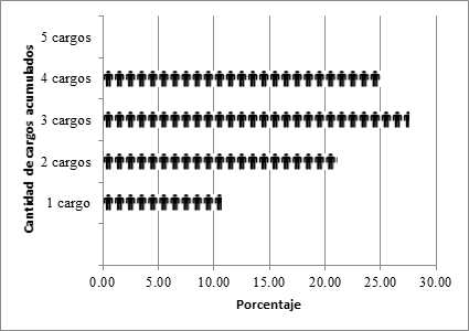 Fuente: Elaboración propia en base a al Libro Matricular de la Honorable Cámara de Senadores y Diputados de la Legislatura de Mendoza, la prensa y el Archivo Histórico del L.M.G.E.La imagen que arroja conjuntamente el cuadro y el gráfico, aunque parcial debido a la confiabilidad de los instrumentos estadísticos en muestras con reducido número de casos, exhibe algunas huellas sobre el papel de las escuelas militares como formadoras de elencos dirigentes, y, en particular, de hombres políticos de Mendoza. La distribución de frecuencias permite observar las trayectorias de quienes se han formado en el L.M.G.E. y describe una carrera profesionalizada: entre los políticos que han acumulado tres cargos, el 27,59% se ha formado en esta escuela. La distribución cae a medida que el reclutamiento se realiza en los carriles o circuitos más bajos que no alcanzan cargos de nivel nacional, y llega al 10,70% entre los elencos que se han dedicado irregularmente a la actividad. 9