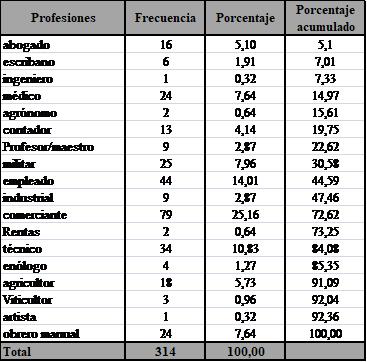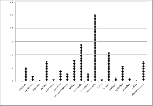 Los porcentajes acumulados exhiben que el sector profesional, vinculado a las actividades liberales, es minoritario, alcanzando apenas el 22,62% de los casos. El grupo que resulta muy significativo es aquel de los comerciantes (25,16%), que integra a individuos que poseen pequeños puestos de ventas, tanto como viajantes y representantes, e integran la categoría socioprofesional de los cuentapropistas. Luego, el grupo de los comerciantes es seguido por el de los empleados, que tiene como rasgo común el integrar al sector asalariado, e incluye un conjunto heterogéneo de tareas y formaciones. Allí, el empleo público es el mayoritario, e incluye tanto al personal que trabajaba en los ferrocarriles, como a los administrativos de ministerios. Una porción no desdeñable de este colectivo se dedicaba a tareas administrativas en pequeños establecimientos o empresas. Los hijos de militares alcanzan el 7,96%, un porcentaje bajo si se atiende al tipo de instrucción que ofrecía este tipo de enseñanza. Asimismo, la categoría de militar encierra en sí misma una sugerente diversidad, al incluir en la misma a los hijos de oficiales y suboficiales del Ejército, quienes presentan status, sociabilidades y recursos económicos diferenciados. Por último, en la escala más baja de posiciones, se observa la importante presencia de técnicos, agricultores y obreros manuales, jefes de hogar que han tenido una escasa instrucción, y que alcanzan un 24,20%.