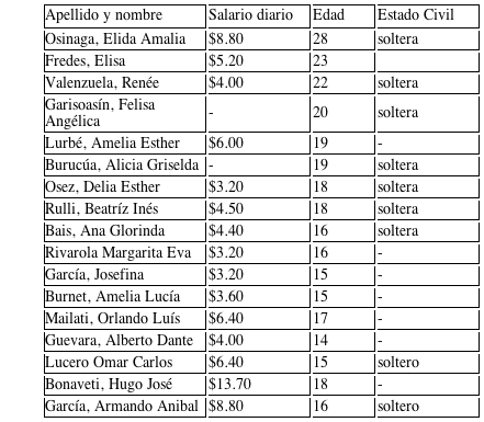 La tabla fue confeccionado a partir de la información dispersa en el acta que los trabajadores y trabajadoras firmaron con motivo del conflicto en la Delegación Regional de la CGT, y los datos vertidos en la audiencia judicial. Del mismo se desprenden varias cuestiones relevantes. En primer lugar, permite dimensionar la gravitación de la mano de la mano de obra femenina, la cual era mayoritaria en todo el establecimiento. Éstas eran predominantemente jóvenes –algunas de ellas menores de edad– y solteras, lo cual era por entonces la situación más convencional no sólo en Argentina, sino también en otras ciudades latinoamericanas (Lobato, 2007; Farnsworth Alvear, 2000).