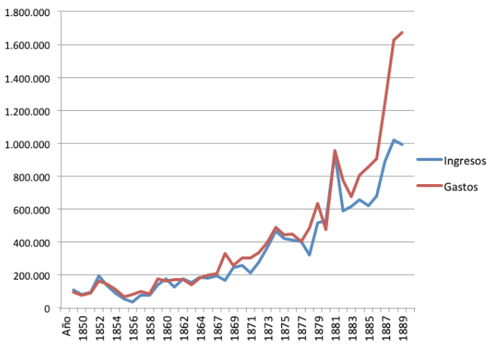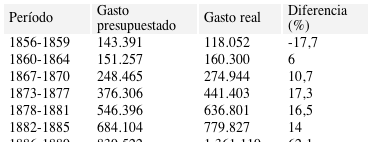 Pese a que la inversión de los fondos estaba regulada por el presupuesto con frecuencia el gasto real no se ajustaba a lo establecido en el cálculo. Los primeros presupuestos de fines de la década de 1850 fueron muy optimistas en cuanto a la obtención de recursos por lo que, en la práctica, el gasto real fue inferior a lo estimado. A partir de la década de 1860 los egresos superaron a los cálculos aunque la ampliación del gasto estaba muy condicionada por la escasez de ingresos genuinos y el limitado acceso al crédito. Las diferencias, a veces muy importantes, que se produjeron durante algunos años eran compensadas en los ejercicios siguientes. En consecuencia, si se considera el acumulado de varios años la diferencia entre el gasto presupuestado y el real no fue tan grande hasta segunda mitad de la década de 1880.