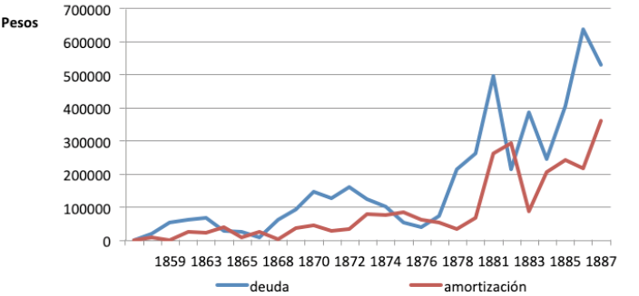 A partir de la ley del 8 de agosto de 1863 se inició una nueva etapa en la evolución de la deuda pública en la cual procedimiento regular para solventar las obligaciones atrasadas y gastos extraordinarios fue la emisión de títulos de deuda que daban un interés y podían emplearse, en proporción variable, en la compra de tierras.51 La primera emisión se estableció para cubrir los compromisos pendientes del período 1855-1861, valuados en $52.000. Esta obligación se redujo rápidamente pero a partir de 1868 la deuda volvió a crecer de manera sostenida hasta 1872 como consecuencia del recrudecimiento de los enfrentamientos civiles. Al finalizar ese año la deuda pública alcanzaba a $161.500 equivalente al 58% de los ingresos. En 1873 se inició un período de mayor estabilidad en el cual gran parte de los recursos fiscales se destinaron a reducir los compromisos. En esta política posiblemente influyó del clima general de austeridad que generaba la crisis económica del país. Hacia 1876 la deuda alcanzó su nivel más bajo, unos $39.900.