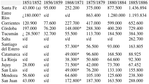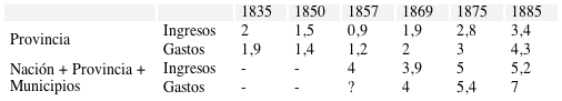 En cuanto a las unidades monetarias hay que señalar que entre 1841 y 1863 las cuentas de la provincia están expresadas en moneda metálica y en moneda corriente. La primera era el peso plata de ocho reales del período colonial que en relación con el oro se cotizaba a diecisiete pesos la onza (25 gramos). La segunda correspondía a los billetes inconvertibles emitidos por el gobierno provincial y cuya cotización con la moneda metálica era muy variable. Para unificar los valores se han utilizado las equivalencias que aparecen en los periódicos locales. Entre 1864 y 1882 la unidad utilizada fue el peso fuerte de plata que de acuerdo con la ley nacional del 22 de octubre de 1863 se cotizaba a dieciséis pesos la onza. A partir de 1883 se empleó el peso moneda nacional y los billetes del Banco Nacional comenzaron a reemplazar a la moneda metálica. El peso papel era convertible con su equivalente metálico (el peso oro de 1,6 gramos de valor similar al peso fuerte). Sin embargo, en 1885 se abandonó la convertibilidad y el billete perdió valor en relación con el metálico aunque en este trabajo se han mantenido sin cambios los montos que aparecen en la documentación.6