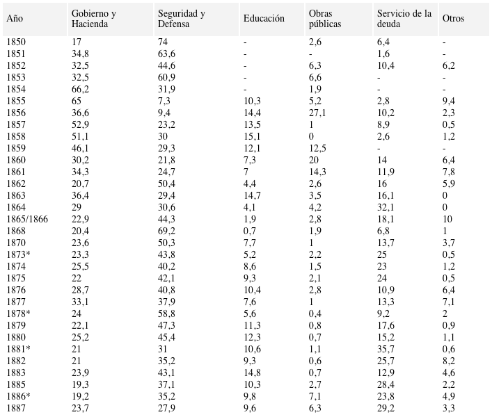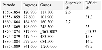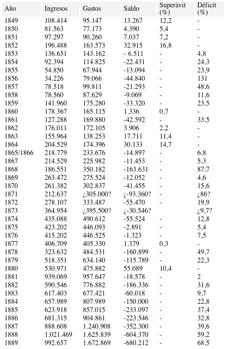En cuanto a la administración de los fondos públicos hasta principios de la década de 1880 el objetivo prioritario fue la búsqueda del equilibrio fiscal. La función del gobierno era crear las condiciones estabilidad y seguridad jurídica para el crecimiento económico sin gravar excesivamente la riqueza particular. Esta prudencia respondía también a las dificultades para recaudar de los impuestos y para financiar el déficit por medio del endeudamiento. Sin embargo, la disciplina fiscal era imposible en los frecuentes períodos de inestabilidad de la época. En ellos el aumento del gasto extraordinario normalmente coincidía con una caída de las rentas lo que resultaba en un fuerte incremento de la deuda flotante.