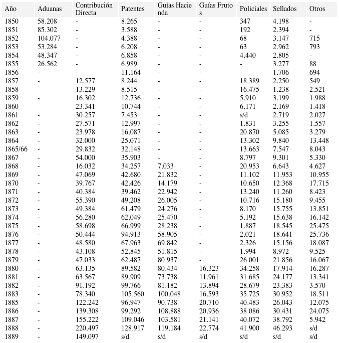 Los datos estadísticos de recursos y erogaciones de la provincia incluidos en este trabajo son de elaboración propia en base a diversas fuentes. Para el lapso de 1850 a 1862 se utilizaron los Libros de Caja y Contaduría guardados en el Archivo Histórico de la provincia. La serie se interrumpe como resultado de las reformas de las reparticiones de hacienda y hasta el presente no se ha logrado ubicar los libros contables de la nueva etapa. No obstante, en la colección “Expedientes Administrativos” del Archivo se han encontrado copias de los registros de 1863 a 1868, 1870 y de 1885 a 1888. Para los años restantes se utilizaron publicaciones oficiales. Entre las editadas por el gobierno de la provincia de Corrientes se destacan los mensajes de los gobernadores, que suelen incluir valiosos anexos, la “Memoria del Ministerio de Hacienda” del año 1879 y los Registros oficiales. De las publicaciones nacionales son fundamentales los informes anuales del presidente del Crédito Público, Pedro Agote. Finalmente también se consultaron periódicos locales del período 1855-1864.5
