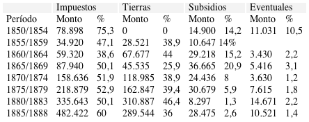 Durante la etapa previa a la organización nacional los ingresos regulares de la provincia dependían de manera sobresaliente de los derechos aduaneros. A partir de la transferencia de las aduanas el origen de los recursos fue un poco más variado. La adjudicación de tierras públicas pasó a ser una fuente de ingresos similar a la percepción de impuestos. Creció el número de tributos aunque las entradas principales provenían de tres gravámenes (Contribución Directa, Patentes y Guías de Hacienda). Una novedad fundamental fue la obtención de subsidios otorgados por el gobierno nacional que en esta etapa representaron un aporte suplementario a los ingresos de la provincia. La importancia de estas fuentes dentro del conjunto de las rentas fue variando a lo largo del período estudiado.