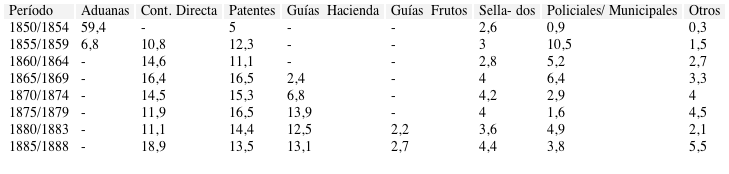 La pérdida de los derechos aduaneros en 1855 requirió la reconstrucción del sistema impositivo. Ésta se desarrolló principalmente entre 1856 y 1869 años en que se introdujeron reformas fundamentales a los derechos existentes y se establecieron nuevos impuestos. De estos últimos los más significativos para las finanzas fueron la Contribución Directa (1857) y las Guías de Hacienda (1868).22