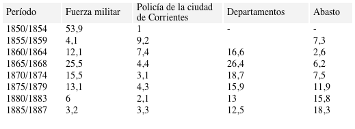 En la etapa previa a la organización nacional la función prioritaria del Estado provincial era el mantenimiento del orden interno y la defensa del territorio. Aún en tiempo de paz la mayor parte del gasto público se destinaba al sostenimiento de una fuerza militar permanente y a las milicias movilizadas. Hasta 1853 el ramo de Guerra absorbió regularmente alrededor del 60% de las erogaciones del Estado correntino.39