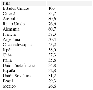 La Argentina figuraba como el octavo país en consumo total per cápita en el periodo 1934-1938, como se puede ver en el cuadro. La lista era encabezada por los Estados Unidos, pero superaba significativamente a España, Italia y los otros países de América Latina. La desagregación de esos consumos muestra que era el cuarto en alimentos y tabaco, después de Estados Unidos, Canadá y el Reino Unido, pero con porcentajes similares a los de Alemania y Francia. En vestimenta, en cambio, la diferencia con los países más desarrollados era grande: casi la tercera parte de Estados Unidos, Canadá y el Reino Unido y Alemania, la mitad de Australia y un tercio menor que Francia. En general, la Argentina se mantuvo en altos niveles generales de consumo, como muestra el Cuadro 1