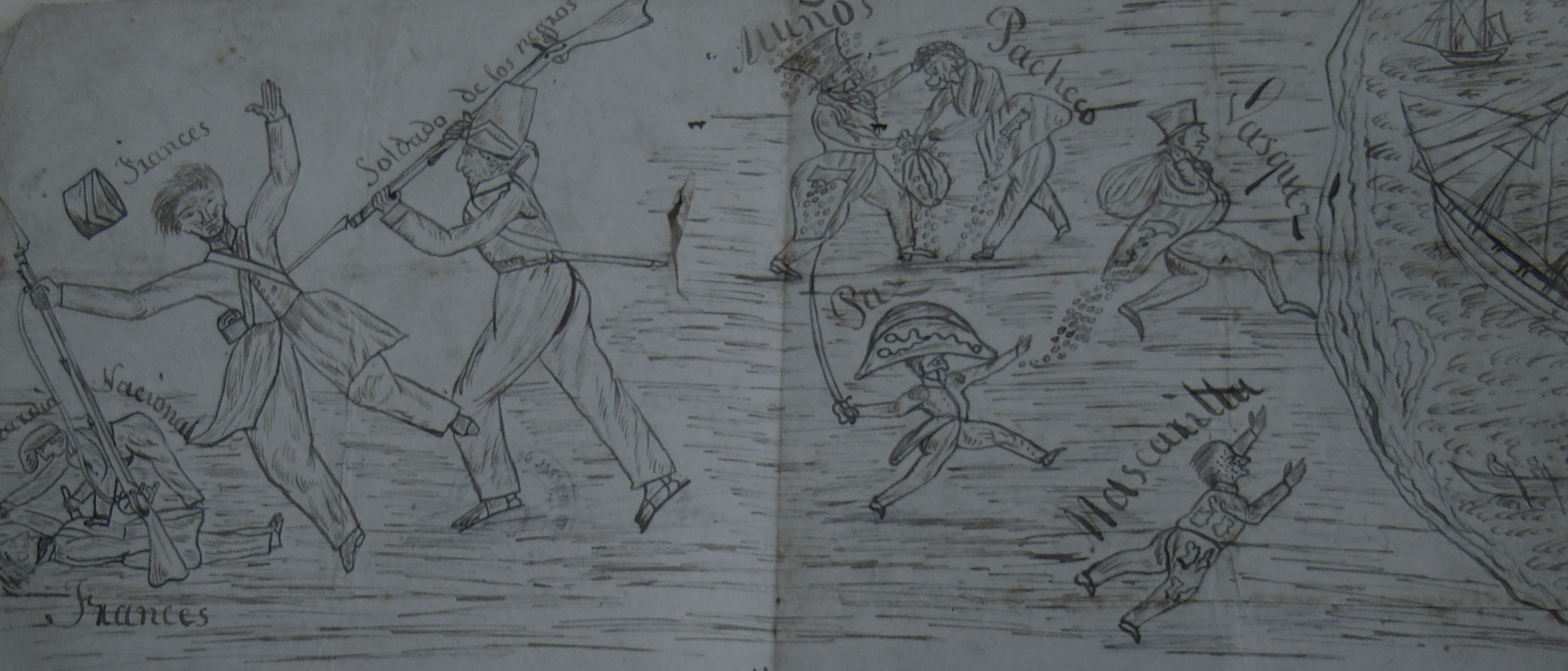 En todo caso, desde el momento de las primeras manifestaciones populares, cargadas de rumores y noticias de toda índole, hasta su concreción como motín, esos días cruciales para la plaza montevideana nos permiten recuperar prácticas y discursos propios del mundo de la “infrapolítica” de los sectores subalternos, tal como propusiera James C. Scott (2000: 217-237). ¿Es posible profundizar un poco más en esta esfera compleja de las motivaciones concretas que impulsaron a los soldados afrodescendientes a actuar? Teniendo en cuenta que se trató de un motín triunfante, no existen juicios y sumarios que nos permitan acceder a las voces de los que lo protagonizaron. Todos los fragmentos arriba citados, así como las referencias historiográficas sobre el episodio, no brindan información precisa sobre las razones del descontento entre los soldados libertos, por ejemplo, que a veces aparecen como meros instrumentos de designios superiores. El punto de vista oficial dado por Vázquez, si bien no presenta grandes novedades respecto a lo que las autoridades suelen afirmar sobre los móviles de estos episodios –“seducciones”, alcohol y dinero– al menos permite entrever algunas evidencias sobre la trama. Según el secretario de Estado, durante los días previos, en los que la fragata Perla se había transformado en “el taller de la conspiración permanente”, los partidarios de Rivera expandieron rumores difamatorios sobre el robo de fondos públicos que debían ser destinados al abastecimiento de las tropas, aprovechando “la ignorancia de algunos hombres de color, y las privaciones á que los sujeta naturalmente la situacion del pais”. En particular, los instigadores de la rebelión habrían comenzado a calumniar a Pacheco y Obes asegurando que “caudales destinados á su alivio [de la tropa], caudales enviados por el General Rivera, como lo han vociferado en las calles se habían empleado en otros fines”, prometiendo a su vez a los potenciales insurrectos que, en cuanto el caudillo desembarcara y se pusiera a su frente, “iba a llenarlos de goces y recompensas”. Estas “seducciones” llevadas a cabo individualmente, siempre según la versión oficial, “eran acompañadas y fortificadas con el dinero que se ha derramado entre ellos en cantidad relativamente crecida y con el uso de bebidas espirituosas con que han alterado su razon”.42 Esta misma versión, acerca de sumas distribuidas por los riveristas entre las tropas libertas, fue referida en junio de 1846 por Hilario Ascasubi que, de acuerdo a varios testigos, sostuvo en un café público que Bernardina Fragoso “con cuatro vintenes había comprado los negros”, afirmación que le valió ser detenido e interrogado por considerarse que sus dichos afectaban el honor de la guarnición montevideana.43 El cónsul inglés Turner también aludió en sus informes a la distribución de “carteles explicativos y dinero” entre los efectivos, como uno de los medios privilegiados para movilizar lealtades.44 Aunque no sabemos a ciencia cierta en qué consistían esas “explicaciones”, aparte de los ya citados pasquines, la imagen de unas autoridades públicas que usurpaban fondos destinados a las tropas no parece haber sido un factor circunstancial o, al menos, ya había sido instrumentada como arma política contra los defensores de Montevideo, como lo demuestra una caricatura de autoría y fecha desconocida que, probablemente, por las figuras públicas a que alude, está referida al bienio 1843-1844 (ver Figura 1). En esa hoja suelta aparecen varios miembros del gobierno de la capital huyendo hacia el puerto y disputando por dineros públicos, acompañados de rótulos con descripciones coloridas. Entre ellos vemos cómo “Muñoz y Pacheco pelean por una volsa de Plata”, mientras el General José María Paz “corre enloquecido pr qe Vázquez se lleva la Plata y a el no le dan nada” y “Mascarilla [Juan Pablo López] corre sin un quilate pidiendo el vote”. En la misma escena se observa un “Guardia Nacional” y un “soldado de los negros” -normalmente considerados por los oribistas como las únicas tropas orientales de la ciudad- apuñalando a dos legionarios franceses, que se supone que revistaban en el mismo bando. Cuando uno de los ultimados exige una explicación, exclamando “Pur qua bu me done la mort¡¡” el efectivo de las tropas libertas esgrime argumentos similares a los que Vázquez atribuyó a los “conspiradores” de abril de 1846: