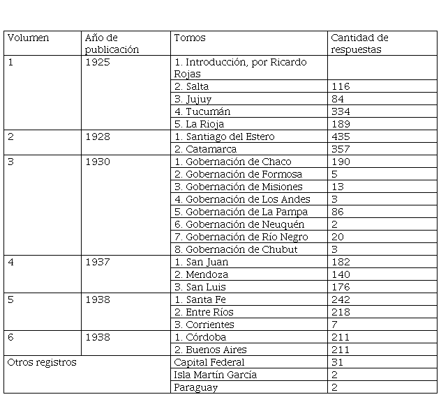Acaso ninguna repartición pública se hallaba en mejores condiciones para llevar a término esta empresa, por el número y la índole de sus funcionarios; pero la premura con que se realizó el trabajo y la interpretación no siempre fiel que los maestros dieron a las instrucciones recibidas, así como la diversa riqueza de los acervos comarcanos y la varia capacidad de los corresponsables, contribuyeron a hacer que el material recogido, aunque valiosísimo por su cantidad, carezca, sin embargo, de una armonía sistemática entre las diversas partes que lo constituyen. (Rojas, 1925: vi)