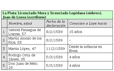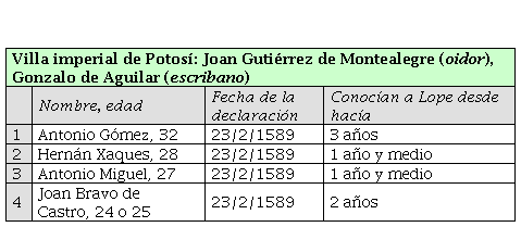 En cuanto a los testigos de Potosí, Antonio Gómez, natural de la villa de Torres Nouas, en el reino de Portugal, constituye un ejemplo más de la presencia portuguesa en la región. Fue él quien aportó información sobre lo acontecido en Bahía de Todos los Santos cuando Lope y el otro cautivo lograron escapar de los ingleses. Todos estos testigos declararon que conocían a Lope Vázquez Pestaña de aquel puerto. Dos de ellos, el citado Antonio Gómez y Hernán Xarques (flamenco), estaban en la fortaleza como guardias cuando vieron llegar a nado y desnudos a Lope y al otro marino, que según Xarques, se llamaba Nuflo Rodríguez (aunque no aparece en ninguna otra fuente esta información).