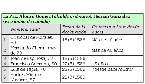 Aquí en La Paz encontramos que los seis declarantes conocían a Lope desde hacía mucho tiempo, y este grupo proveyó información sobre el estado civil de Lope, especialmente sobre Gonzalo Cerón, padre de su esposa Catalina Cerón. Asimismo, todos destacaron el estado de pobreza en el que se encontraban Lope y Catalina, después de haber sido robado por los ingleses.