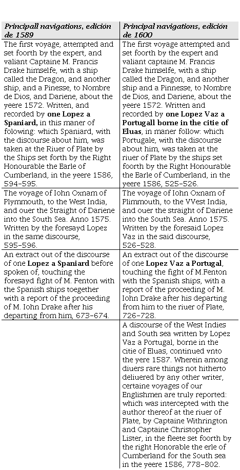 Hakluyt, en la primera y segunda edición de la colección, publicó diversos textos y extractos que fueron abiertamente atribuidos a “Lopez”. En la edición de 1589, la primera mención del cautivo aparece como “Lopez a Spaniard”. Sin embargo, en la segunda edición de 1600, Lope Vázquez figura como “Lopez Vaz un portugués nacido en la ciudad de Elvas” (ver Cuadro 4). Podemos preguntarnos cómo obtuvo Hakluyt la información sobre el lugar de nacimiento, quién pudo haberle dado este detalle, y también podemos interrogarnos por la inexactitud del nombre y cómo se pasó de “Lope” a “Lopez” y por qué el apellido “Vázquez” fue cortado en “Vaz”, dejando completamente de lado el “Pestaña”.