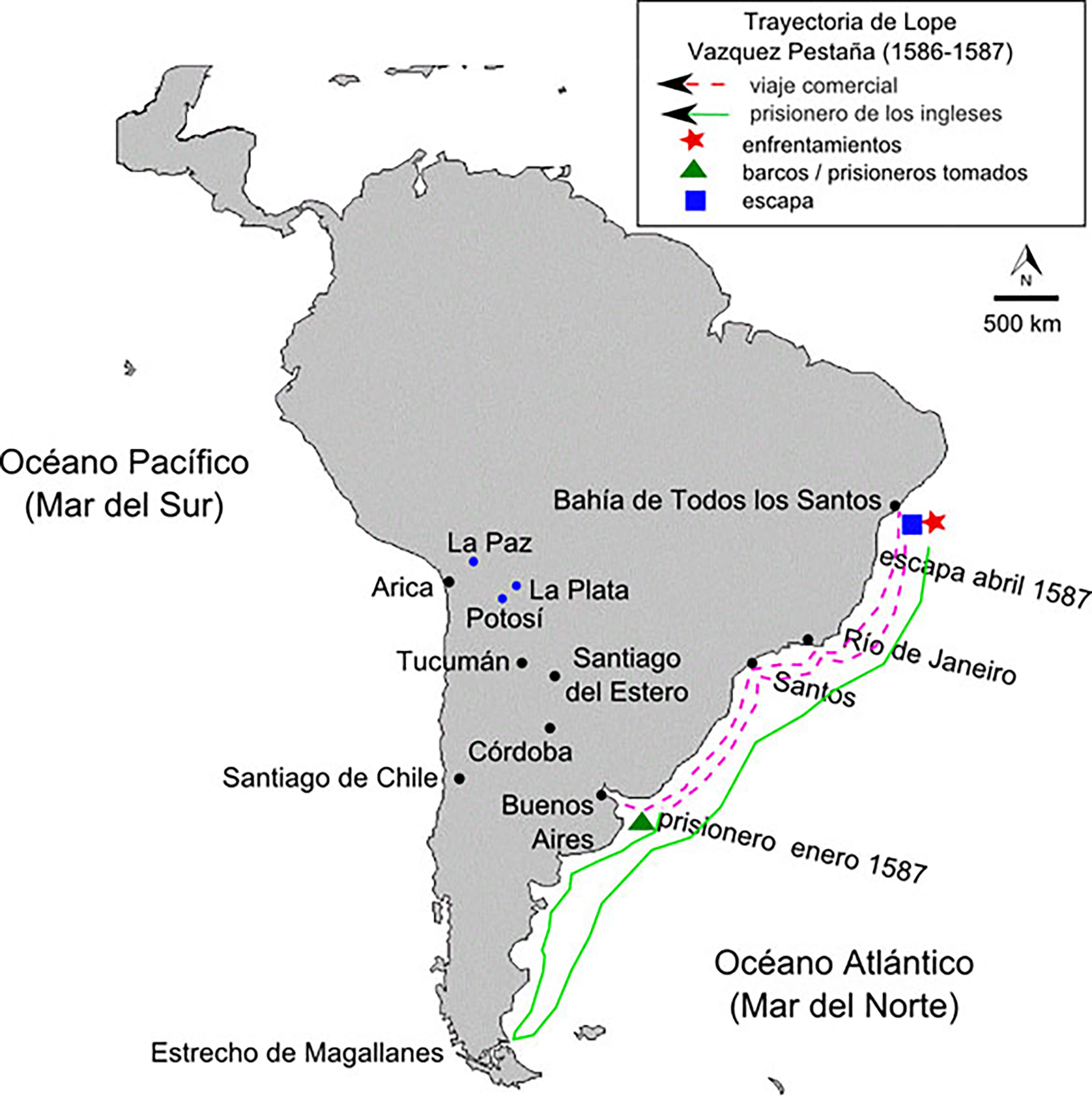 En el relato de Sarracoll publicado por Hakluyt no se menciona nada más respecto a los prisioneros evadidos, y no fueron encontradas otras publicaciones inglesas que refieran a los episodios sobre “Lopez Vaz”. Existe otro diario de bitácora sobre el viaje, correspondiente al piloto Thomas Hood del Red Dragon. En él sólo hay dos referencias relacionadas con Vázquez Pestaña. La primera es sobre el encuentro con el barco: “Y avistamos otra pequeña embarcación y la apresamos hacia las 12 AC estaba cargada con azúcar y negros y se dirigía hacia el Río de la Plata”.9 La segunda menciona el día en el que los prisioneros escaparon: “El día 17 de abril 2 de nuestros prisioneros se escaparon durante un mal tiempo hacia el río y fueron náufragos, el viento era NNE”.10 Hasta donde sabemos, la narrativa de Sarracoll en la colección de viajes de Hakluyt, pareciera ser la única fuente publicada en el siglo XVI que se refiere a “Lopez Vaz”.11