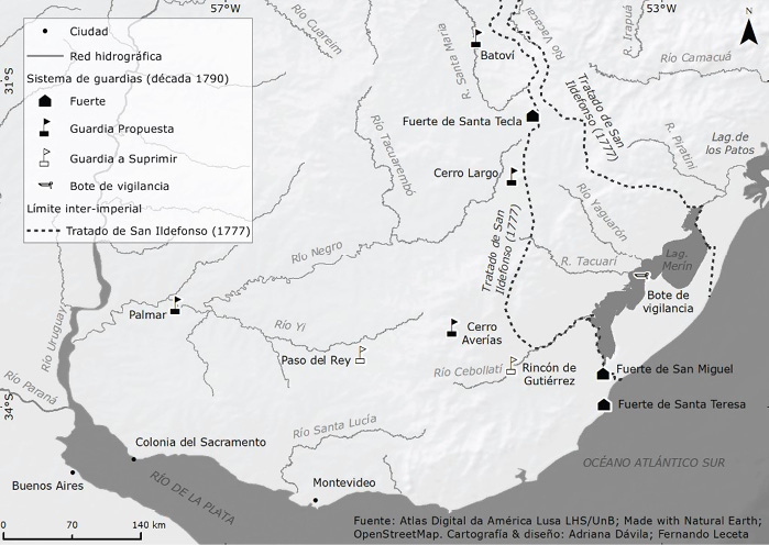 En la década de 1780 existían las siguientes guardias: Paso del Rey, sobre el río Yi; el fuerte de Santa Tecla, en las nacientes del Río Negro, y los fuertes de Santa Teresa y San Miguel, sobre la costa atlántica. Debido a la importancia que cobraron los tráficos ilícitos por tierra durante los años cubiertos por este estudio, la Real Hacienda estableció una guardia propia en el paraje Rincón de Gutiérrez, a orillas del río Cebollatí (ver mapa).