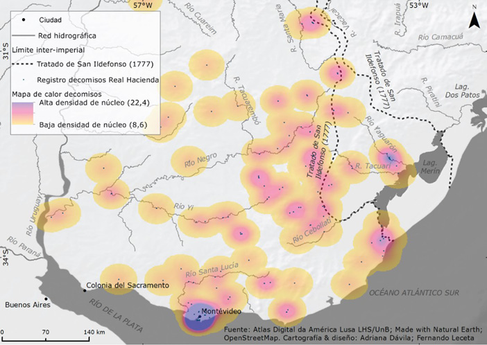 Al norte del Río Negro, sus nacientes, así como los territorios por donde cursa el río Tacuarembó, formaban parte de una secuencia de parajes que atravesaba la estancia comunal del pueblo misionero de San Miguel y hacían parte del camino portugués de las tropas en dirección al Río Pardo (Gil, 2020). Finalmente, el contrabando estaba presente en territorios que, como Colonia, tenían conexión muy fácil con la orilla occidental del río Uruguay. Cabe aclarar que aunque el Mapa 3 no contiene puntos del otro lado del Río de la Plata, eso no quiere decir que los tráficos procedentes de la línea fronteriza no alcanzaran la otra orilla, sino que su represión estaba fuera del alcance del Resguardo de Montevideo.