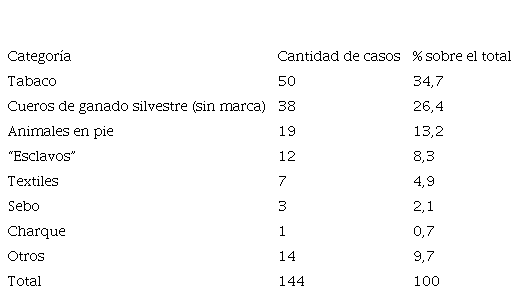 El Cuadro 1 muestra la frecuencia que presentan los distintos tipos de bienes incautados, tomando en cuenta la totalidad de casos disponibles. El cuadro muestra que el tabaco negro (proveniente de Brasil) y los cueros (obtenidos de ganados del lado español) eran los bienes más frecuentemente decomisados, seguidos por los animales en pie ingresados al territorio lusitano. Aunque no es posible afirmar que esta frecuencia represente la composición total del tráfico terrestre, esta evidencia confirma que, tal como los denunciaban los numerosos informes de las autoridades del período, el tabaco, los cueros y los animales vivos formaban un trío recurrente.