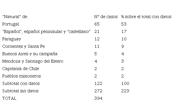 Como se trata de un 31% del total de casos, la información debe tomarse apenas como un indicio. La otra mitad estaba formada por súbditos de Castilla: la mayoría procedía de diversos territorios del virreinato del Río de la Plata y cerca de un tercio de este subconjunto era español de origen. Si bien no es posible descartar que los vasallos españoles tuvieran mejores oportunidades de escapar que sus pares portugueses frente a las partidas de la Real Hacienda española, es claro que el tráfico ilícito era una actividad en la que revistaban vasallos de ambos imperios.