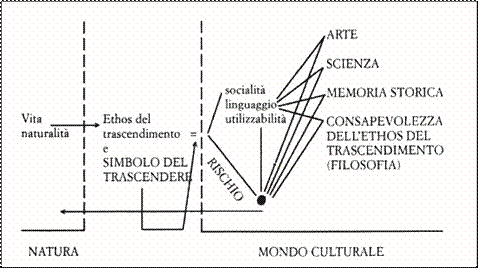 Para explicar ese tránsito de la naturaleza al mundo cultural, De Martino (2005: 8) se sirve del siguiente esquema que encontramos entre los escritos filosóficos preparatorios de su libro póstumo: