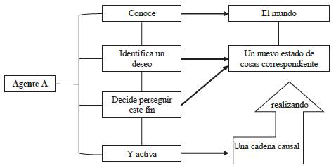 De esta manera se tiene que una acción en cuanto evento, viene a ser un hecho que conlleva una dinámica de cambio, la modificación de un estado de cosas; pero tal cambio depende de unos sujetos que actúan por sí o mediante un agente. Una representación de tal estructura de la acción es la siguiente:
