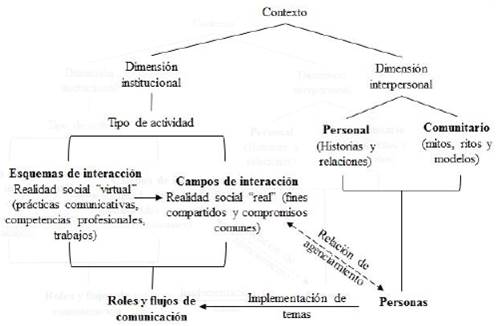 De acuerdo con lo anterior hay que decir que la “implementación de esquemas de interacción en campos de interacción genera un red de roles (…) que están conectados entre sí, mediante sus correspondientes flujos comunicativos” (Rigotti & Rocci, 2006, p. 173), pero además tales roles son ejercidos por personas; de ahí que aparezca la dimensión interpersonal que contempla el diagrama antes presentado de contexto comunicativo. En tal sentido, considerar la dimensión interpersonal es importante porque muestra que “el sujeto mantiene sus intereses y fines, los cuales pueden ser congruentes o pueden entrar en conflicto con el rol en sí mismo. Este es, en efecto, un típico caso de relación de agenciamiento.” (p. 174).