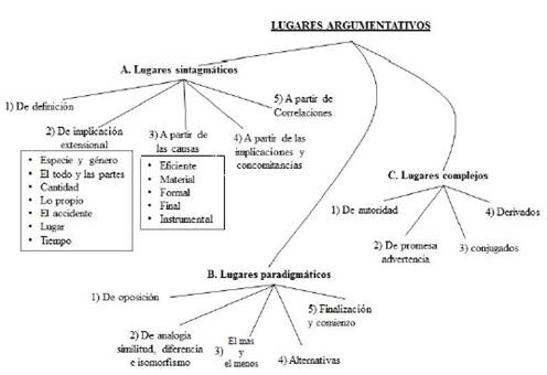 - Loci: estructuras semánticas básicas para generar conexiones inferenciales entre datum y el punto de vista. Hay que decir además, que los loci tienen una dimensión sintagmática que los hace referirse al asunto en cuestión y una dimensión paradigmática que los hace referirse a posibilidades alternativas al punto de vista.