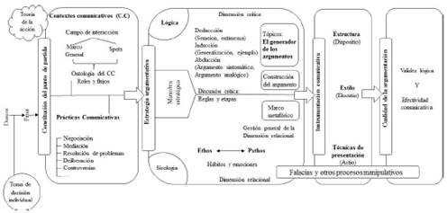 Como se ve, el modelo tiene cuatro componentes: 1) constitución del punto de partida, 2) diseño de estrategias argumentativas, 3) instrumentación comunicativa y 4) reflexión acerca de la cualidad argumentativa.