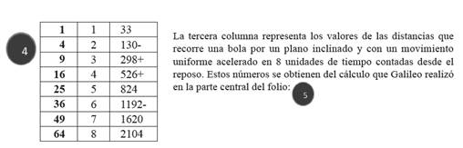 (1, 5, 9, 13, 17, 21) sobre dicha regla, la cual indica que Galileo aún no contaba con la ley de caída libre.