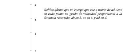 Reflexionando acerca de los problemas del movimiento, para los cuales, y con el fin de demostrar los accidentes observados por mí, me faltaba totalmente un principio indubitable que pudiese poner como axioma, he llegado a una proposición que tiene mucho de natural y evidente; y supuesta ésta, demuestro después el resto, particularmente que los espacios atravesados por el movimiento natural están en proporción doble del tiempo, y por consiguiente los espacios atravesados en tiempos iguales son como los números impares ab unitate y las otras cosas. Yel principio es éste: que el móvil natural va aumentando de velocidad en la misma proporción en que se aleja de su punto de partida; verbi gratia, si un grave cae del punto a por la línea abcd, supongo que el grado de velocidad que tiene en c es al grado de velocidad que tenía en b como la distancia ca es a la distancia ba, y así, por consiguiente, tendrá en d un grado de velocidad mayor que en c en la medida en que la distancia da es mayor que la distancia ca. (Carta a Sarpi, 16 ottobre 1604, Opere, [1900], Vol. X, p. 115)12