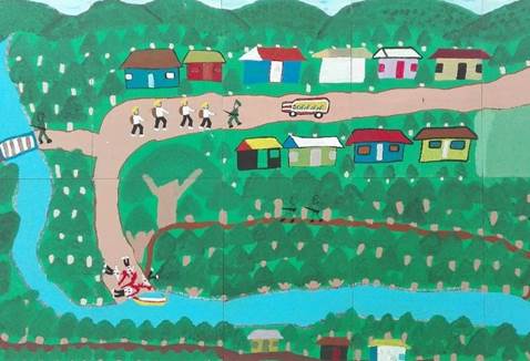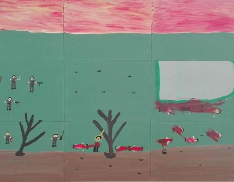 Allí, como en “Piel al sol” o “La cosecha de los violentos”, el territorio también está presente, es decir, la violencia como paisaje y el paisaje de la violencia. Pero, a diferencia de las obras señaladas, los paisajes no han sido creados por artistas, pues “La guerra que no hemos visto” se realizó mediante unos talleres de pintura en los que participaron 17 exparamilitares de las AUC, 30 exguerrileros y 14 exguerrilleras de las FARC, 1 exguerrillero del ELN y 18 soldados del ejército nacional heridos en combate, quienes en conjunto produjeron más de 400 pinturas de las cuales 90 fueron expuestas por primera vez en el Museo de Arte Moderno de Bogotá (2009).8 Algo que llama la atención del conjunto de las pinturas es el verde, las montañas y los valles, la presencia de la naturaleza estrechamente unida al rojo de las masacres (Imagen 1, p. 95). Más que pinturas en un sentido experto, estas imágenes son cartografías cuyos aspectos formales se construyen, por un lado, mediante el centrado y la frontalidad y, por el otro, mediante planos cenitales y picados. La representación de los hechos es ingenua desde el punto de vista formal, una candidez en el modo de representar en el que, sin embargo, nada de lo representado resulta ingenuo.9
