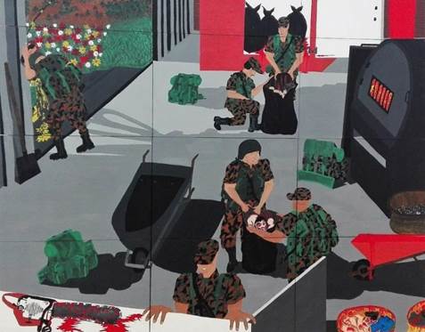 El cuadro de John Gerardo, modesto formalmente hablando, tiene una potencia sobre aquello que narra. Parece ser el primer testimonio público sobre los hornos crematorios y el único, hasta el momento, sobre hornos crematorios de los paramilitares funcionando en instalaciones estatales. Cuando el arte pone en juego la activación del habla, sus resultados no son inmediatos. Son procesos de larga duración para los que resulta indispensable el compromiso del artista con la comunidad participante. En otras palabras, la relación entre el artista y la comunidad no puede estar fundamentada en relaciones pasajeras, si lo que se busca, desde luego, es la construcción de la memoria del conflicto armado reciente.