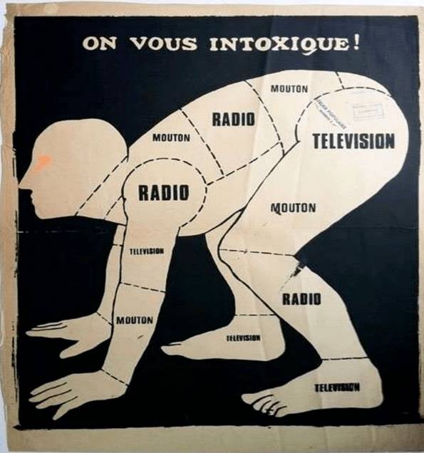 Despite the relentless self-critique (even self-derision) of the Situationists, many of Debord’s phrases and statements became part of the Posters and Graffiti of the May ’68 events and emergent social movements. In the figure below, however humorous or satirical, we see a reinforcement of the critique of ideology. On Vous Intoxique -You Are Being Poisoned! (Vermès & Kugelberg, 2011, p. 5). This is the continuity with the Marxist tradition, the media spectacle of the ’60s world being interpreted through the prism of ideology critique. You are being duped by television, radio, consumerism, capitalism. The overt critique of capitalism is shared by the Marxist and anarchist- Situationist perspectives.