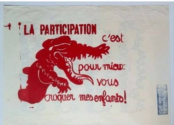 But the avowal of a critique of ideology also comes with a significant philosophical health warning from the Situationists and this is a self-satire that is also prominent in ’68 and again visible in the posters. “Participation - All the Better to Eat You With My Children!” (Vermès & Kugelberg, 2011, p. 6). How the dream of emancipation and the empowerment of the underclass (or “the children” here as another example of infantilism) runs aground! Perhaps all this talk of increasing radicalisation and democratisation (“we are so much more radical than you are”) is just another ruse to co-opt any potentially transformative action into complicity with the forces of power. This poster and this declaration also contains an angry and somewhat disillusioned question; what then would authentic participation in the revolution be, what would it look like? What could it possibly feel like in the real world beyond the spectacle? Is there even such a place?