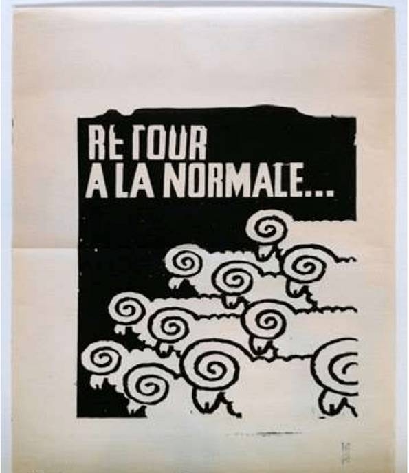 The final poster and slogan we will look at here takes the discussion on one stage further. “Return to Normal” —the failure of participation leads to the failure of the revolution leads to the reinforcement of the status quo. What’s worse —without the revolution, there would be no return to normal. It is precisely the pseudo-revolution that acts as a condition of possibility for the reinforcement and maintenance of power in the longer-term, primarily as it allows a certain “illusion” of change to keep the previously restless population happy. We go back from figure 3 to figure 1. On Vous Intoxique. The Revolution is the Ideology; May ’68 itself becomes the propaganda. This is also then the vicious circle of Debord’s analysis and the overriding lesson of Situationism. The Spectacle is Everywhere! As Debord states in Thesis 42 —“The Spectacle is the stage at which the commodity has succeeded in totally colonising social life” (Debord, 1990, p. 24). The fatal danger for Leftism in a critique of contemporary capitalism is thus that it becomes merely part of the problem, while obscuring the potential political and social resolution.