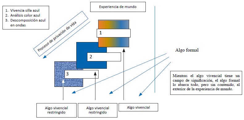 Heidegger llama desvivificación al proceso que transforma el algo encontrado en la vivencia en un algo que cada vez remite menos a ella. Por ejemplo, tomemos la experiencia del color de una silla azul. Dentro de la vivencia, el color puede ser para decorar una sala, porque le gusta a alguien o porque debía combinar con otros colores del lugar. Con la visión de la ciencia inicia el proceso que aparta el algo de la vivencia. El azul es una onda que a su vez se explica por el comportamiento de los átomos, fotones. Cada paso de la explicación se hunde en un campo determinado de la vivencia. Ya no hay referencia a quien la vive, tampoco referencia al estar en un lugar determinado, simplemente vemos el azul y después dentro de él. El algo formal de la donación material, sin embargo, no obedece la misma tendencia, sino que puede aparecer en cualquier estado y tampoco es el límite o último paso de la ciencia. En la vivencia y en el proceso de la ciencia, silla es algo, el color es algo, los fotones son algo, pero siempre en un contexto determinado. La silla es azul, el color es luz, pero la silla no es color. Estos algos aún conservan conexiones significativas dadas en la experiencia misma. Por ello, la teorización formal es cualitativamente distinta del proceso de las ciencias. Esta última puede referirse a la silla, al color, a las partículas, a todo lo posible como algo. Guarda relación con el algo de la vivencia, pero lo extrae de todo contexto significativo. Podríamos visualizarlo en un diagrama: