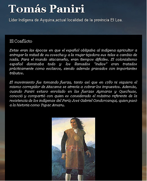 Como forma de ejemplificar las tensiones y los diversos actores que participan de este proceso que gravita sobre la cultura atacameña a través del reconocimiento de una determinada historia, presentaré en forma esquemática un estudio de caso: el uso de la figura de Tomás Paniri, líder indígena del siglo XVIII. Distinguiré a lo largo del texto tres momentos: el primero, su construcción como sujeto histórico a través de descubrimientos documentales (1970-ad.); el segundo, su transformación en símbolo del movimiento atacameño (1990-ad.); y el tercero, su incorporación a las narrativas estatales de lo multicultural. El análisis del tratamiento que se ha hecho de la figura de Tomás Paniri me permitirá ejemplificar diferentes tipos de articulaciones entre grupos étnicos, campo académico y Estado a lo largo de diversas épocas, tanto previas como posteriores al proceso de emergencia étnica.