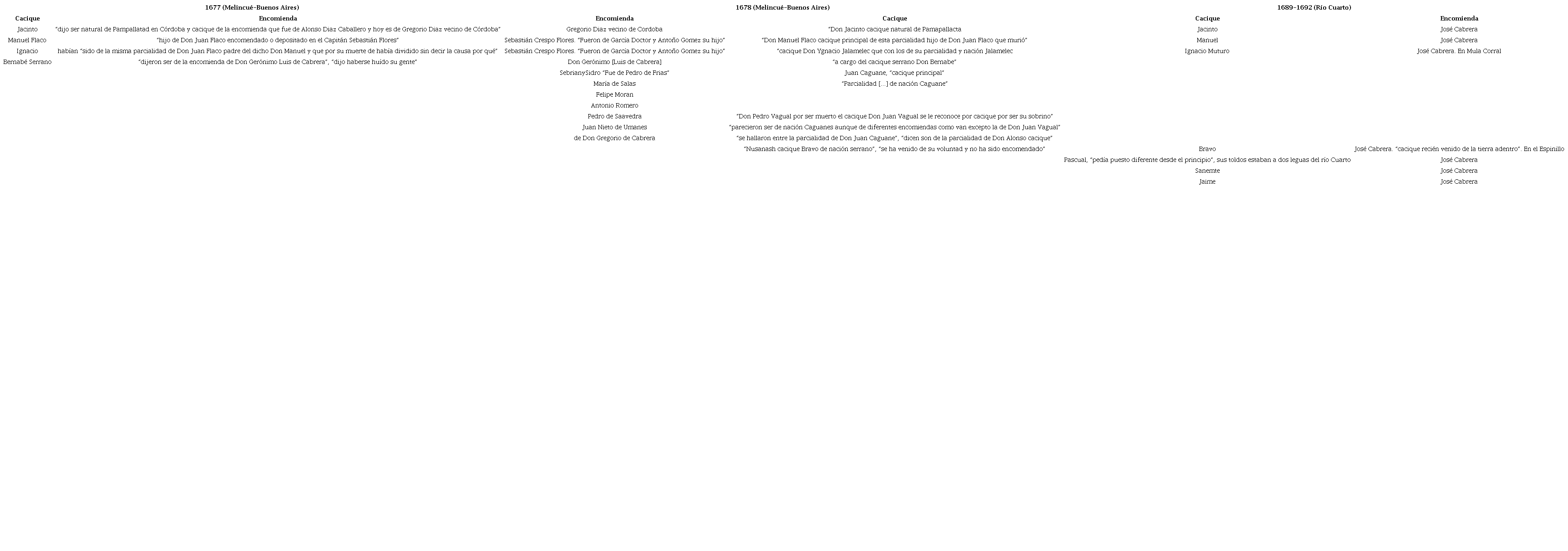 En la segunda mitad del siglo XVII, caciques denominados Ignacio y Bravo fueron registrados juntos en más de una oportunidad. Por ejemplo, en 1677, con el pretexto de unos robos cometidos por algunos indígenas, Manuel de Robles emprendió una expedición que se dirigió a “la vuelta de la sierra por el paraje de Melincué” donde apresó a “ciento trece personas de todos sexos y edades”.13 Unos días más tarde, a fines de ese año, se confeccionó un padrón en la ribera del Río de la Plata en la ciudad de Buenos Aires con una división de los grupos en base a sus caciques. Entre los empadronados figuraban Ignacio, Jacinto -"natural de Pampallatad en Córdoba y cacique de la encomienda que fue de Alonso Díaz Caballero y hoy es de Gregorio Díaz"-, Manuel Flaco -"hijo de Don Juan Flaco encomendado o depositado en el capitán Sebastián Crespo"-14 y Bernabé Serrano.15 Además, algunos indígenas habían sido asentados como pertenecientes a la encomienda de Gerónimo Luis de Cabrera. Así, observamos que del total de apresados en las cercanías de Melincué y trasladados hacia Buenos Aires, muchos habían estado encomendados previamente en Córdoba, como se menciona en el padrón.