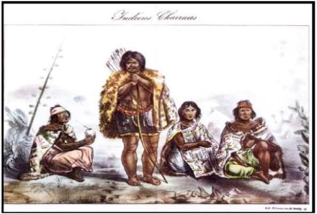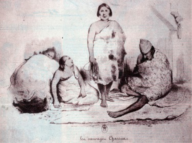 Otra conocida imagen de estos mismos charrúas es la xilografía de Bernard (1833), “Les sauvages charrúas” que acompañó una nota periodística de la época. Aquí, vemos a los “salvajes” vestidos con pieles y harapos, en posición de abatimiento y enfermedad.