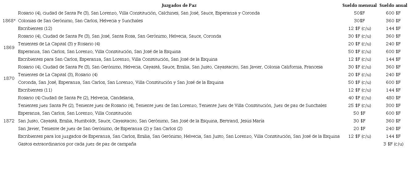 Entre 1856 y 1863, la administración de justicia dobló sus partidas presupuestarias como consecuencia de la creación de nuevas instituciones: la Exma. Cámara de Justicia, la separación de los Juzgados de Primera Instancia en lo Civil y en lo Criminal y el establecimiento de nuevos juzgados de paz en la campaña santafesina.51 En este sentido, se comenzó a considerar la necesidad de otorgar salarios a los jueces de paz de los cuarteles de la ciudad. A mediados de 1860, luego de un intenso debate, se acordó finalmente el pago de un estipendio. Se trató de una medida esencial en el diseño de una arquitectura propiamente estatal basada en una administración más cercana a la visión clásica de una burocracia rentada. Sin embargo, la asignación de sueldos se acompañó de otras medidas como el reordenamiento en el diseño de la plana urbana. El Decreto afirmaba que: “considerando que el n° de jueces de paz que actualmente existen en esta capital y ciudad de Rosario, sin facilitar la administración de justicia en la parte que a ellos está encomendada, produciría un recargo de gastos de consideración sin ninguna ventaja para la administración”.52 Así Santa Fe quedó dividida en tres cuarteles -ya no cuatro- mientras Rosario pasó de seis a cuatro al tiempo que se multiplicó la presencia de la baja justicia, la más cercana a la población, mediante el nombramiento de dos tenientes de jueces en cada cuartel. Por lo tanto, los juzgados de paz de Rosario quedaron integrados por cuatro jueces y ocho tenientes jueces.