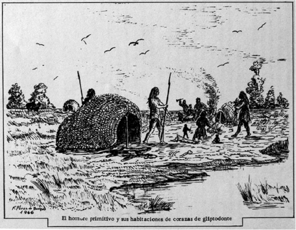 Particularmente, los objetos seleccionados como arqueológicos por estas personas son asociados con la historia indígena, y en ocasiones interpretados a partir de fuentes historiográficas y/o las narrativas arqueológicas elaboradas en la primera parte del siglo XX. A modo ilustrativo, en la Figura 2 se observa la representación de los antiguos pobladores del río Salado que se distribuye en el libro de Antonio Moncaut (1966: 9). Este historiador, ampliamente conocido en la zona, difunde en su libro la teoría ameghiniana sobre la existencia del hombre terciario en la región. Su uso local focaliza más en la representación de lo indígena en clave natural y menos en la profundidad temporal del poblamiento.